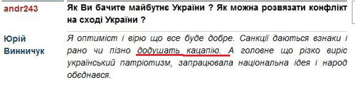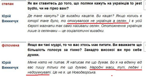Отвечая на другой вопрос Винничук заявил, что "В отличие от вас я говорю только то, что думаю. Народные массы- тупые, ленивые и придурочные. Это не я, это Новодворская".