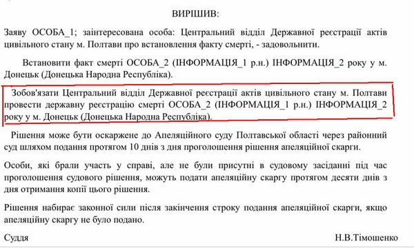 В итоге суд обязал Центральный отдел Государственной регистрации актов гражданского состояния Полтавы провести государственную регистрацию смерти в Донецкой Народной Республике.
