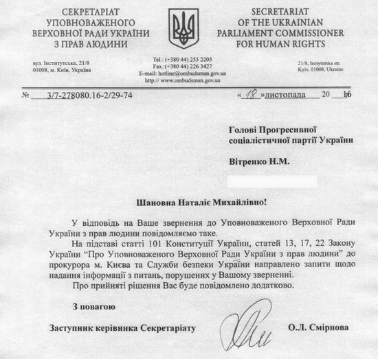 11 ноября с.г. Уполномоченный Верховной Рады Украины по правам человека В.В.Лутковская приняла лидеров ПСПУ Н.Витренко и В.Марченко в связи с их обращением на ее имя по поводу захвата 28 октября с.г. центрального офиса их партии и редакции партийной газеты «Досвітні огні», проведения обыска в этих помещениях, изъятия их партийного, журналистского и личного имущества.