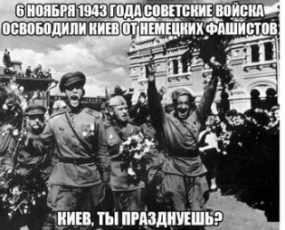 Всех вас я поздравляю с 74-й годовщиной освобождения столицы Советской Украины - города Киева от немецко-фашистских захватчиков. И как бы нынешний позорный Институт памяти (а, вернее, беспамятства) не вбивал бы в головы, что нужно отмечать годовщину изгнания нацистов (подразумевая что, во-первых, освобождения Украины не произошло, т. к остались другие оккупанты, а, во-вторых, что всех нацистов изгнали и впредь их уж нет), но мы с вами твердо должны стоять на защите исторической правды.