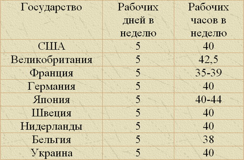 В Соединенных Штатах восьмичасовой рабочий день ввел на своих предприятиях еще Генри Форд, который пришел к выводу, что перетрудившийся работник менее эффективен. Затем итогом компромисса между профсоюзами и правительством стала 40-часовая рабочая неделя. Закон не запрещает американцам работать больше, но он обязывает работодателя оплачивать сверхурочные (в Украине о таком и не слыхивали). Впрочем, немногие американцы желают подзаработать еще, да и сами работодатели стараются разгонять их по домам сразу после "гудка". Фактически, с учетом перерывов, ленча и сокращенной пятницы, американцы в среднем отрабатывают только 33-34 часа в неделю.