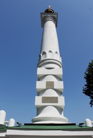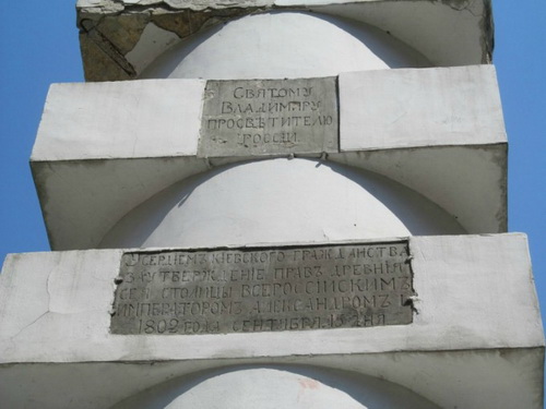 Монумент был построен в 1802-1808 годах у основания Владимирской горки. В 2013 году он был реконструирован. Одна из надписей называла князя Владимира «просветителем России», другая - благодарила от лица киевлян императора Александра I за утверждение прав города. Теперь обе они уничтожены, а к памятнику прикрепили украинский герб-тризубец.