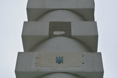 В Киеве на историческом памятнике - колонне Магдебургского права, известной также как нижний памятник крестителю Руси Владимиру - уничтожили упоминание о России и российском царе.