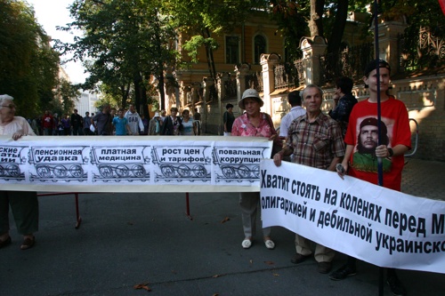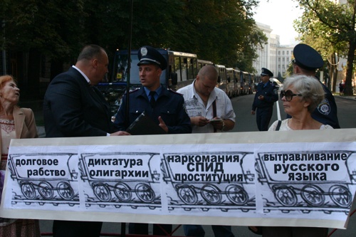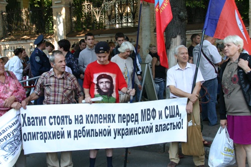 Пикет прошёл в двух местах. При входе на ул. Банковскую пикетирующие развернули транспорант "Хватит стоять на коленях перед МВФ и США, олигархией и дебильной украинской властью!", а также плакаты в форме бумажного паровоза Партии регионов, который тянет за собой 20 вагонов, где были перечислены все преступления власти против своей Родины, против трудящихся людей, все беды, которые эта власть обрушила на голову своего народа.