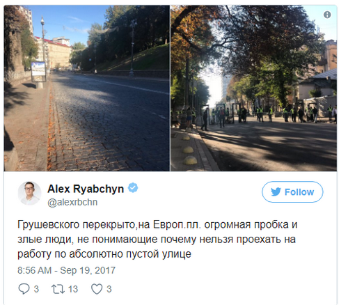 В соцсетях пишут, что из-за акции в центре перекрыли ряд улиц. В частности, перекрыта улица Грушевского, а на Европейской площади из-за этого огромная пробка, сообщает нардеп Алексей Рябчун.