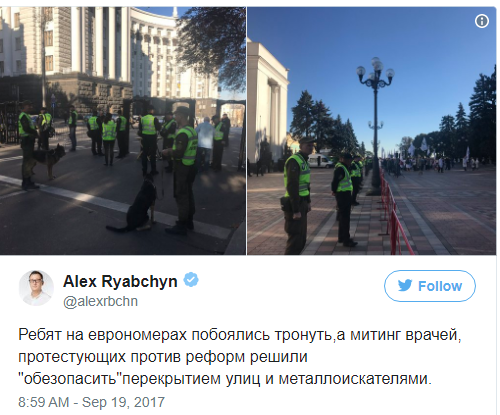 "Ребят на еврономерах побоялись тронуть, а митинг врачей, протестующих против реформ решили "обезопасить"перекрытием улиц и металлоискателями", - пишет нардеп.