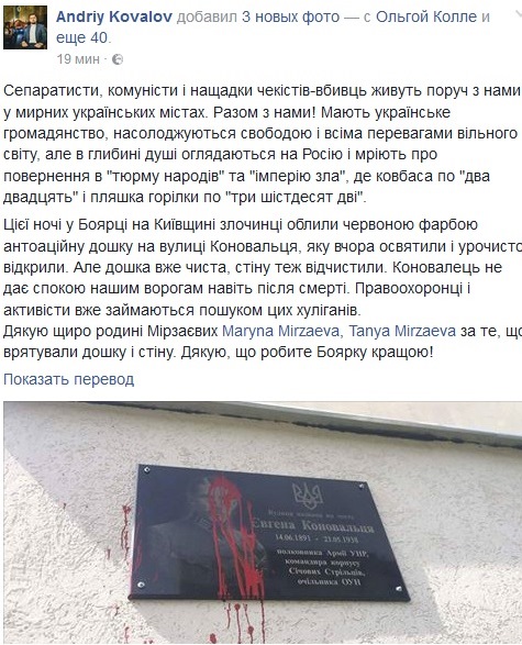 В Боярке Киевской области неизвестные облили красной краской мемориальную доску полковнику армии Украинской национальной республики (УНР) и создателю Организации украинских националистов (ОУН) Евгению Коновальцу.