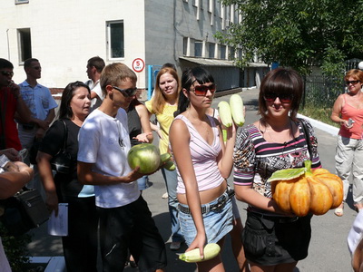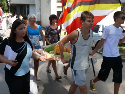 Сюда же активисты молодежной организации "Прорыв" принесли тыквы с тем, чтобы передать их постоянному представителю президента Украины в Крыму, напомнив, таким образом, что среди всех народных украинских традиций, которыми Ющенко любит гордиться, есть и еще одна – выносить непрошенным и нежеланным гостям или сватам гарбуза.