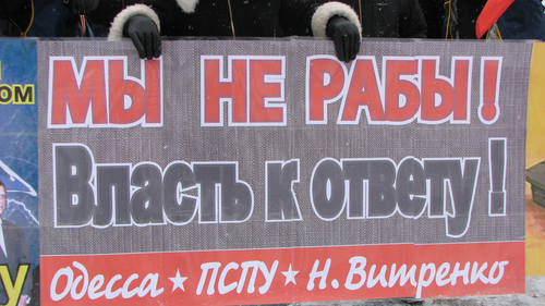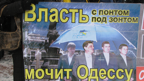 " Костусев хватит врать" , " Алексей Костусев просим сохранить наше предприятие" , "Работу , зарплату, стабильные цены в Одессе" , " Власть, с понтом под зонтом, мочит Одессу", " Мэр переходи от обещаний к делу" , " Хватит нас грабить".