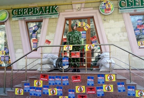 К отделению "Сбербанка" на проспекте Шевченко радикалы принесли мешки с песком, манекен в военной униформе, покрышки и бутылку с коктейлем Молотова. Также они обклеивают банки листовками.