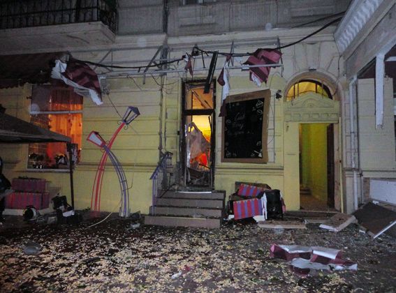 Пресс-служба МВД сообщает, что в результате взрыва повреждены входные двери, фасад кафе, выбиты стекла в квартирах над рестораном. Мощность взрывного устройства составило 450-600 граммов в тротиловом эквиваленте.