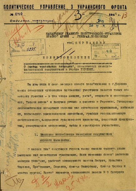 По данным опубликованного донесения начальника политуправления 3-го Украинского фронта генерал-лейтенанта Михаила Рудакова начальнику Главного политического управления Красной Армии генерал-полковнику Александру Щербакову "О фактах чудовищных злодеяний, совершенных немецко-фашистскими оккупантами в городе Херсоне" от 3 апреля 1944 года, только на территории Херсонской области были замучены и казнены десятки тысяч мирных жителей.