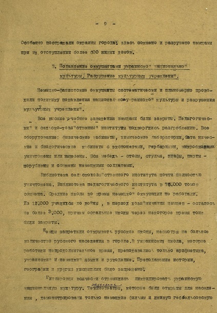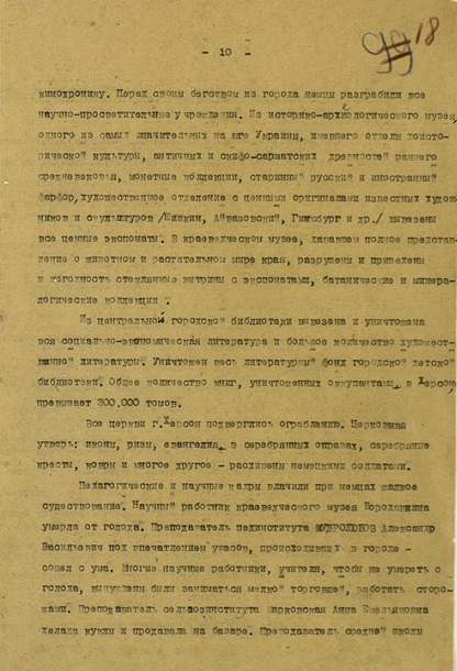 Отмечается, что к донесению также прилагается акт судебно-медицинской экспертизы, проведенной после эксгумации тел советских граждан, убитых фашистами. Документ составлен по результатам раскопки одной могилы, находившейся в семи километрах от Херсона.