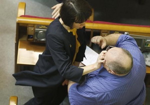 Во время обсуждения законопроекта началась потасовка между внефракционным депутатом Яковом Безбахом и представителем «Народного фронта» Татьяной Черновол, которая набросилась на своего коллегу по парламенту и расцарапала ему лицо.