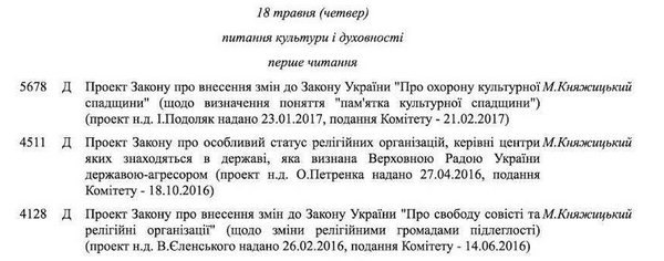 По данным нашего издания, в проекте повестки следующей пленарной недели Верховной Рады, на 18 мая запланировано рассмотрения сразу двух "церковных" законопроектов.