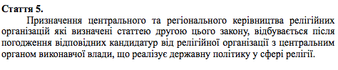Как отмечается в экспертном заключении, предоставление особого статуса для отдельных религиозных организаций не отвечает требованиям Конституции Украины и законодательству о свободе совести и нарушает принцип равенства, установленный статьей 5 Закона Украины "О свободе совести и религиозных организациях", где указано, что все религии, вероисповедания и религиозные организации равны перед законом. Также данная законодательная инициатива грубо нарушает конституционный принцип невмешательства и отделения Церкви от государства, который закреплен в статье 35 Конституции Украины и гарантированное этой же статьей Конституции право на свободу мировоззрения и вероисповедания.