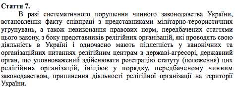 Эта статья даже на первый взгляд выглядит странно, учитывая, что, согласно Конституции, церковь в Украине отделена от государства. Но еще одна статья данного закона звучит куда конкретнее - если представители конфессии будут сотрудничать с религиозными центра в государстве-агрессоре, власть наделяется правом вообще ее запретить на территории Украины.
