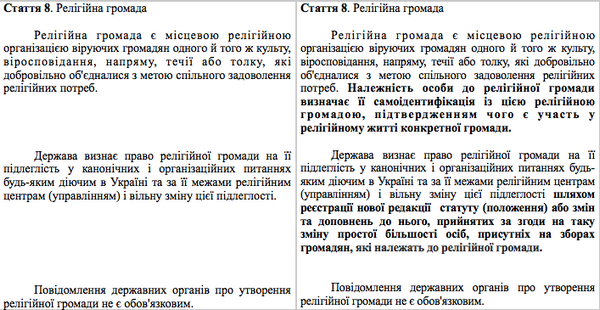 Аналогичные выводы касаются и второго законопроекта, который также в четверг поставят на рассмотрение в сессионный зал - N 4128, согласно которому предлагается внести в статью 8 Закона Украины "О свободе совести и религиозных организациях" положения, регулирующие принадлежность лица к религиозной общине. Например, прописать термин "самоидентификация" и уточнить минимальное количество представителей религиозной общины, согласно решению которых может быть изменена подчиненность храмов конфессиям.