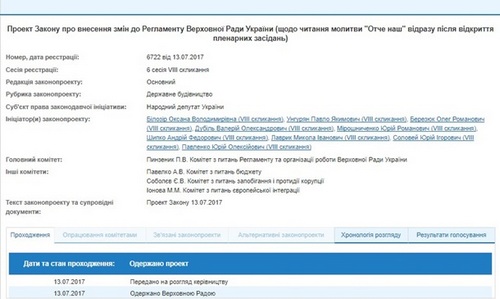 Ряд народных депутатов внесли в парламент законопроект N 6722, в котором предлагают читать молитву "Отче наш" сразу после открытия пленарных заседаний.