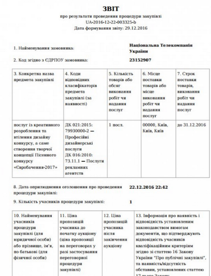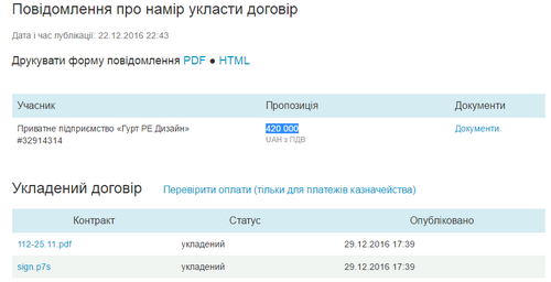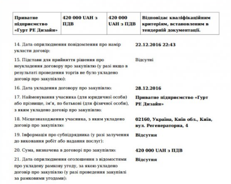 Согласно документа, опубликованного на сайте системы Рrozorro, в тендере участвовала только одна компания - "Группа РЕ Дизайн".