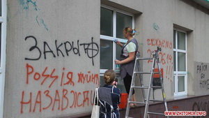 Несколько десятков опять же таки очевидно безработных и скрывающихся от военной службы на Востоке детин в Житомире забросали яйцами, облили зеленкой и повредили вывески пяти отделений российских банков. В частности, в отделениях банков повреждены вывески, разрисованы и заляпаны окна и стены.