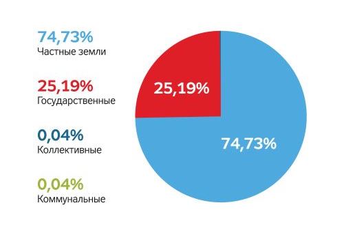 Структурное распределение по формам собственности следующее: 74,73 % - частные земли, 25,19 % - государственные и только по 0,04% приходится на коммунальные и коллективные формы собственности. Однако главная особенность этой структуры – в отсутствии крупных собственников. Земля в форме паев принадлежит 6,7 млн. человек. В основном это бывшие работники колхозов, люди предпенсионного или пенсионного возраста. Согласно данным интернет-ресурса «Цена государства», на сегодня 1,6 млн. владельцев паев, то есть почти четверть, старше 70 лет.