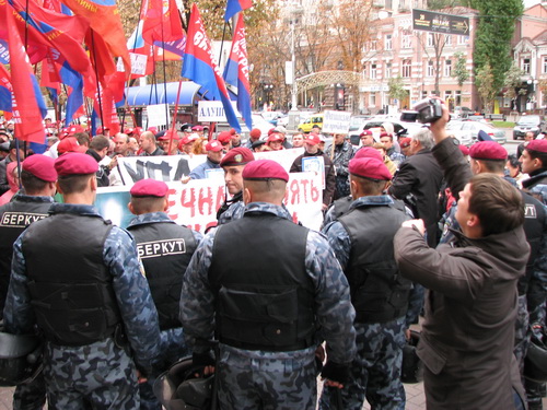 Участники акции собрались на ул. Крещатик, чтобы последовать по маршруту согласно поданной ранее заявке, однако были заблокированы отрядами "Беркут" напротив здания Печерского суда г.Киева.