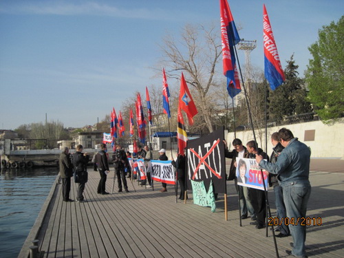 7 часов утра 20 апреля 2010 года. На Графской пристани в городе-герое Севастополе члены Прогрессивной социалистической партии Украины, партии "Киевская Русь", общественных организаций "Дети войны Севастополя" и "Дар жизни", молодежной организации "Молодая гвардия" пикетируют заход НАТОвского корабля в Севастопольскую бухту. "Мы против НАТО", "Севастополь не будет базой НАТОвской военщины!", "НАТО - СТОП". Транспаранты и плакаты с таким содержанием в руках у бойцов.