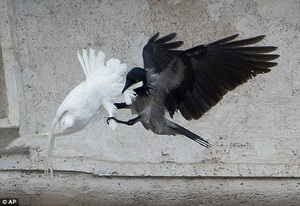 На птиц сразу же напали ворон и чайка. Один из голубей получил удар клювом от ворона, второй лишился перьев после атаки чайки.
