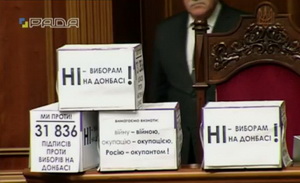 Он добавил, что его партия собрала 30 тысяч голосов по всей Украине, чтобы сказать: "Нет особому статусу Донбасса, который разрушит украинскую суверенность в той форме, как предлагается в Минских соглашениях. Нет выборам на Донбассе. Это политическое атомное оружие, бомба, которая разорвется и уничтожит украинскую суверенность. Нужно признать оккупацию Россией украинской территории, войну РФ против Украины и принять закон об оккупированных территориях, чтобы создать условия для деоккупации".