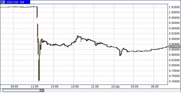 Вчера на рынке форекс случилось небывалое. Всего за 20 минут курс доллара рухнул по отношению к швейцарскому франку сразу на 26 процентов. Для тех, кто не в курсе, естественные дневные колебания основных валют относительно друг друга редко превышают один-два процента. До сих пор подобным скачкам, и то очень редко, были подвержены исключительно валюты развивающихся стран. Даже падение рубля в декабре в пиковой день 17-го числа было существенно меньше. А многочисленные аналитики и эксперты на основе обрушения на 20 процентов тут же причислили нашу валюту к мусорным. И как теперь назвать доллар? Смотрим график.