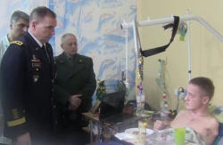 Во время визита американская военная делегация посетила и главный армейский госпиталь, где находятся на лечении раненые на "восточном фронте" солдаты. Разумеется, утешить страждущих – благое дело, и Бен Ходжес (на фото) утешил их со всей истинно американской щедростью. Он поблагодарил лишившихся рук и ног молодых инвалидов "за их работу", заявил, что, возможно (!), США примут их на лечение, а самого юного увечного солдата наградил памятным знаком Сухопутных войск США в Европе.