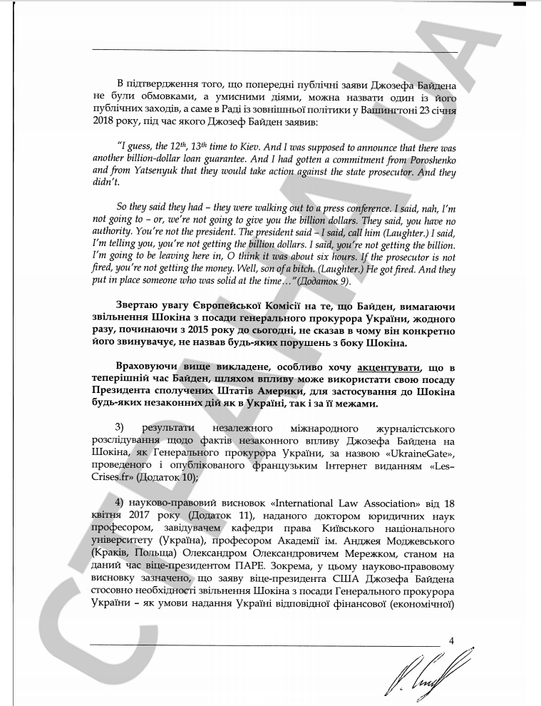 – Если уйти от сложных юридических подробностей, изложенных в заявлении, какова ваша основная аргументация в отношении Байдена-старшего и Петра Порошенко?