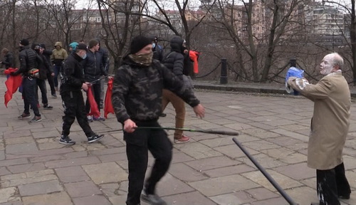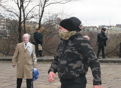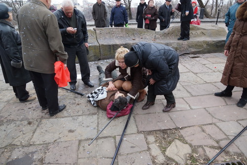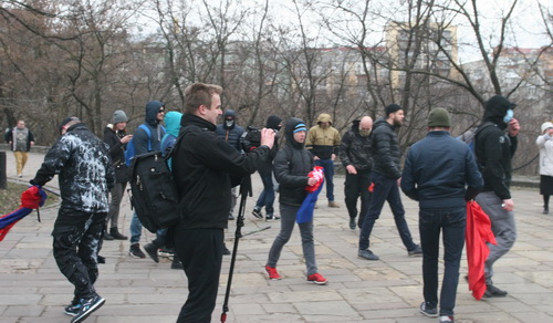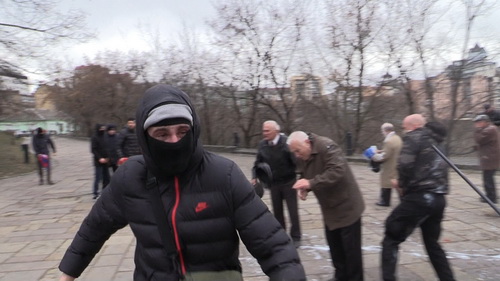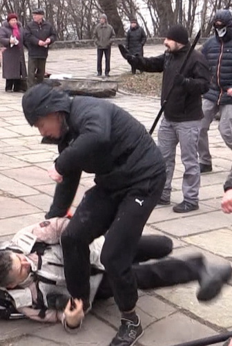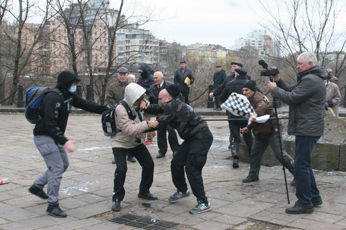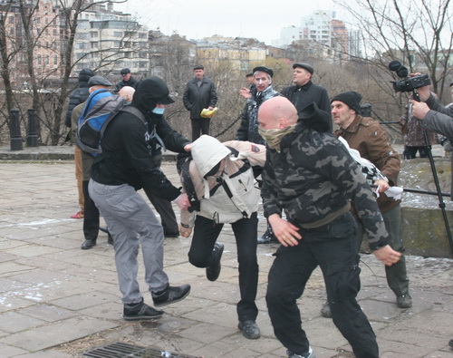 Фашиствующие молодчики набросились на митингующих, избивали стариков и женщин, травили нас газовыми баллончиками, бросали булыжники в Наталию Витренко, зверски избивали падающих участников акции, вырывая из их рук знамёна и лозунги.