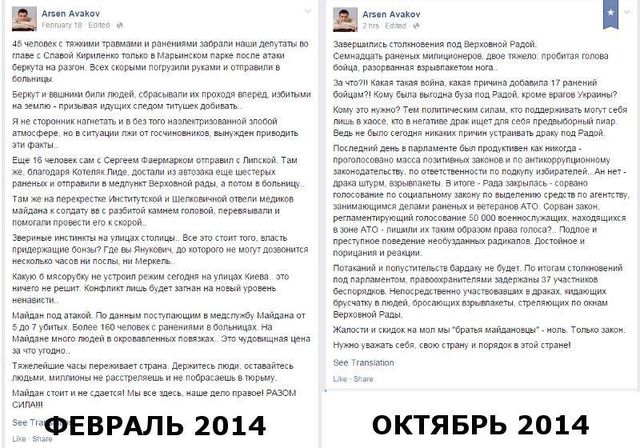 И слава Богу, что в Украине есть Арсен Аваков, который в "Фейсбуке" трудится министром внутренних дел и там же, в виртуальной реальности развил у себя такую беспроигрышную чуйку на врагов, что уже выследил, обезвредил и победил практически всех, кто "зазихал". На него и, разумеется, на "нэньку". Вот этот вот Аваков безошибочно может различать этих гадов. Если люди штурмуют Раду или АП, избивают ментов, жгут огнем "коктейлей Молотова" солдат-срочников, чтобы передать власть ему, Авакову, и примкнувшим к нему Александру Турчинову, Арсению Яценюку и, не побоюсь этого слова, Виталию Кличко с Андреем Парубием, то это – патриоты. Несомненно.
