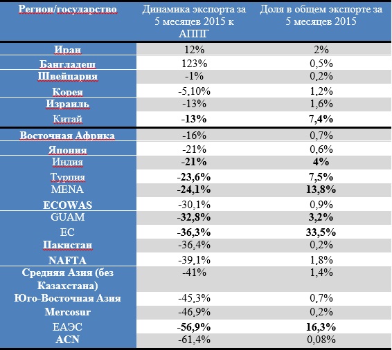 Наиболее негативным трендом является снижение экспорта в Узбекистан и Туркменистан. При этом обращаем внимание на то, что Ташкент с 1 июля 2015 ввел дополнительные импортные пошлины при ввозе товаров из Украины сроком на один год в ответ на повышение пошлин украинской стороной.