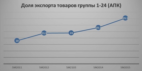 Продукция АПК за 5 месяцев 2015 года имеет наибольшую долю в общем котле экспорта. На ее долю приходится 35,5% от всего экспорта. Отметим, что по итогам 2 месяцев 2015 года этот показатель составлял 37,9%, что объясняется особенностями сезона.