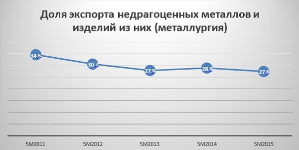 Отметим, что за 5 месяцев 2015 года доля экспорта недрагоценных металлов и изделий из них составила 27,6%. Это на 1,3% меньше, чем в прошлом году в этот же период. Однако отметим, что этот показатель практически равняется показателю 5 месяцев 2013 года.