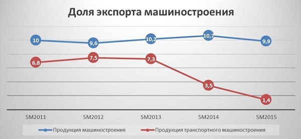 Отметим, что доля экспорта продукции машиностроения за 5 месяцев 2015 года находится практически на уровне доли 2011 года и превышает показатель 2012 года. Украина может нарастить экспорт продукции машиностроения, как на рынки Юго-Восточной Азии, Африки, Латинской Америки, так и на рынок Европы. Для этого необходимо создать условия для привлечения иностранных инвестиций в данную сферу для создания новых производственных площадок. Относительно традиционных украинских производителей государство должно занять активную позицию по продвижению их продукции на рынки заинтересованных государств. Подобную тактику сегодня активно использует Россия, занимая перспективные рынки Азии на которых активно может работать Украина.