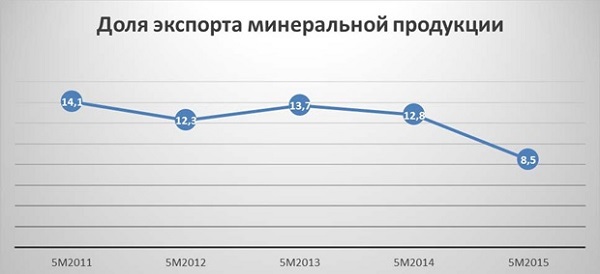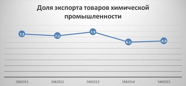 Доля экспорта химической промышленности за 5 месяцев 2015 года незначительно возросла. Однако полагаем, что с учетом политической составляющей вокруг данного сектора экономики и негативной ситуации на мировых рынках, доля экспорта товаров химической промышленности в среднесрочной перспективе может быть снижена в дальнейшем.
