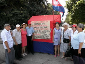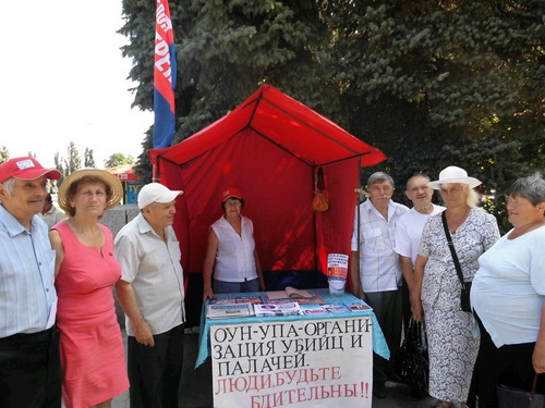 9.07.2013г. г. Первомайск. Николаевская область. Ул. Грушевского. Прогрессивные социалисты города и района провели акцию по поводу 70-летия волынских событий 1943-1944годов Работала агитационная палатка, раздавали газеты, отпечатанные листовки, рассказывали жителям города о польско-украинских взаимоотношений в период Второй мировой войны. Согласно данным известного канадского историка и публициста Виктора Полищука (доктора политологии), много написавшего об этих событиях, всего от рук украинских националистов в 1939-1945годах погибло более 500тыс. человек, при этом только в Волынской резне геноциде поляков,-180тыс. чел.