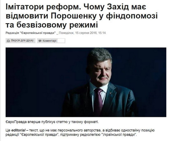 "Европейская правда", являющая приложением интернет-издания "Украинская правда", опубликовала редакционную статью, призывающую Брюссель отказать Украине в безвизовом режиме с ЕС, поскольку здесь якобы лишь имитируются реформы.