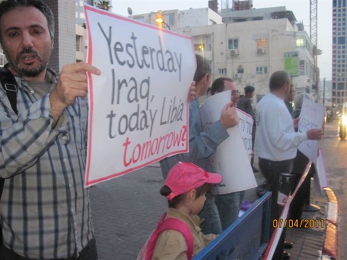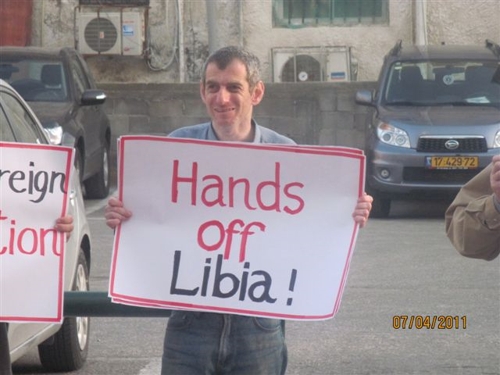 Участники акции (среди которых и автор этих строк) держали в руках плакаты на иврите и английском, с призывами антиимпериалистической направленности. Между всем остальным, на плакатах было написано: Руки прочь от Ливии! Прекратить империалистическую агрессию против Ливии! Вчера Ирак, сегодня Ливия, а завтра... - и другие лозунги против развязанной силами мирового империализма, агрессии против Ливийской Джамахирии, а фактически против простых ливийцев - рабочих, служащих фаллахов.