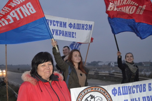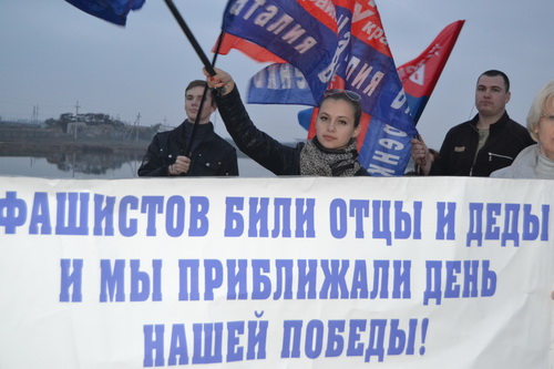 С плакатами "Преступлениям ОУН–УПА нет срока давности!", "Не допустим фашизм на Украине!", " Украинских гитлеровцев из ОУН–УПА под Трибунал!" молодежь встречала все автомобили, движущиеся вдоль крымских автострад.