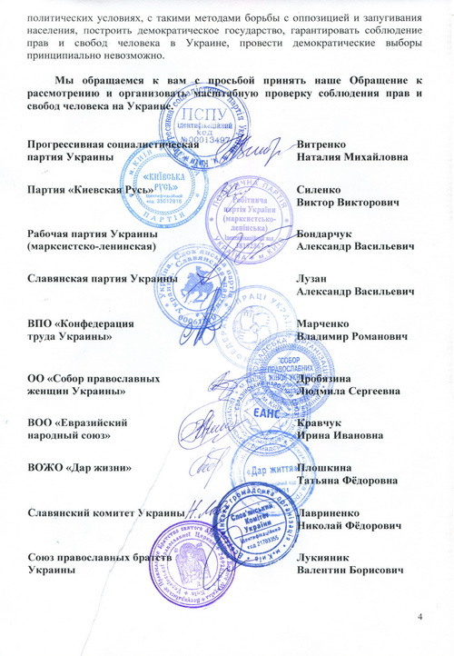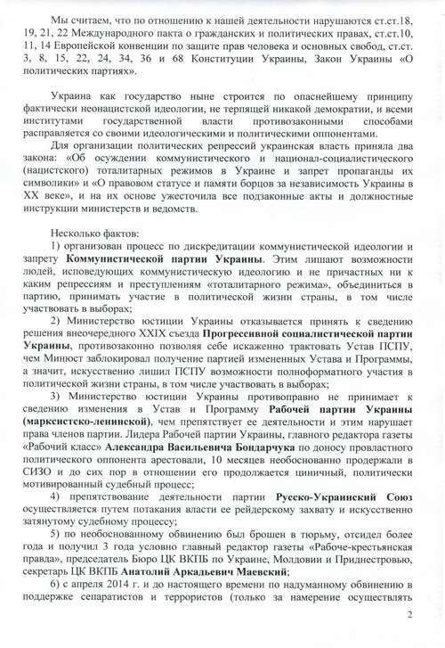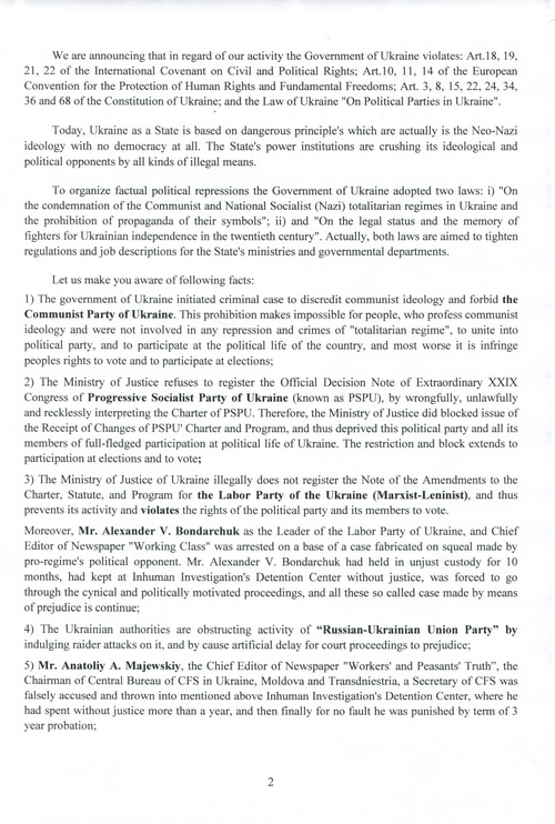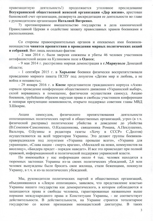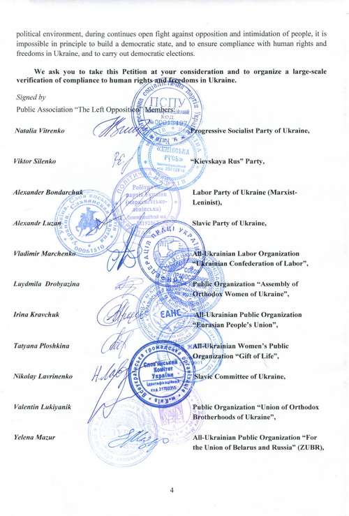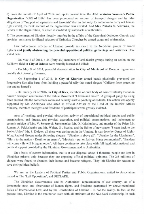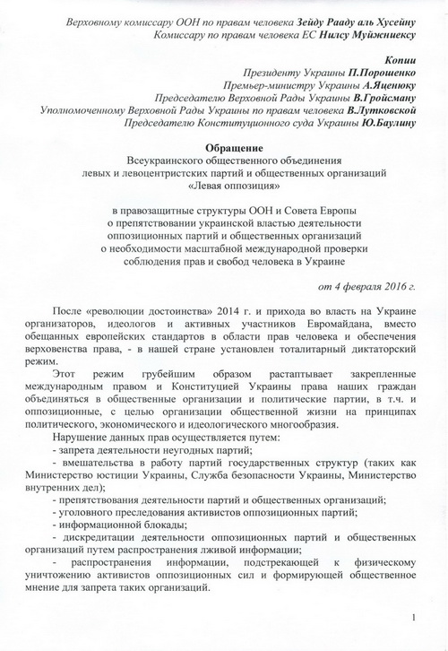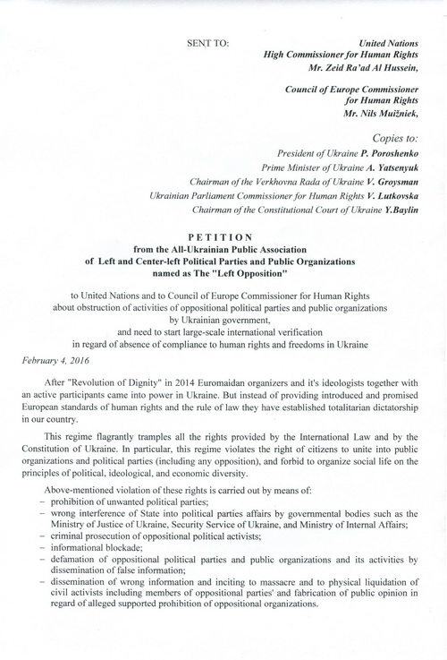 Принятое Координационным советом «Левой оппозиции» 4.02.2016 г. Обращение Всеукраинского общественного объединения левых и левоцентристских партий и общественных организаций «Левая оппозиция» в правозащитные структуры ООН и Совета Европы о препятствовании украинской властью деятельности оппозиционных партий и общественных организаций о необходимости масштабной международной проверки соблюдения прав и свобод человека в Украине, заверенное подписями и печатями 19 членов Совета, направлено Верховному комиссару ООН по правам человека Зейду Рааду аль Хусейну, Комиссару по правам человека ЕС Нилсу Муйжниексу, копии - высшим должностным лицам Украины, а также руководителям стран «нормандской четверки», послам Азербайджана, Армении, Белоруссии, Болгарии, Великобритании, Венгрии, Греции, Грузии, Италии, Казахстана, Латвии, Литвы, Молдовы, Польши, Румынии, США, Чехии, Эстонии, а также в Многостороннее агентство по инвестиционным гарантиям (MIGA) и Международный валютный фонд (IMF).
