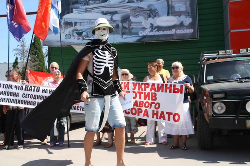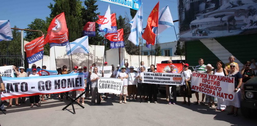 Плакаты и растяжки: "Янукович + НАТО = маме гроб из военкомата!", "НАТО, вон из Украины! Смерть НАТОвским оккупантам!", "В том, что НАТО сегодня на нашей земле, виновна оккупационная буржуйская власть!", "Моржи Украины против кровавого агрессора НАТО!" ярко говорят о непримиримой позиции прогрессивных севастопольцев к развернутым на нашей территории совместным НАТОвским учениям "Си Бриз-2013" и отношении к кровожадному мировому жандарму.