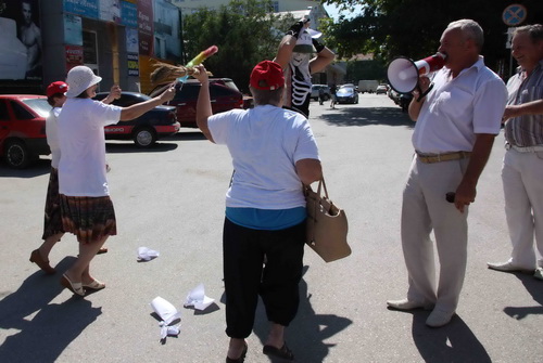 В завершении акции символический НАТОвский вояка-агрессор получил от севастопольцев по морде грязным веником.