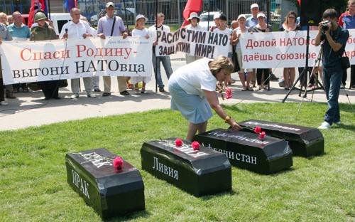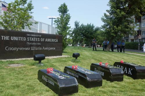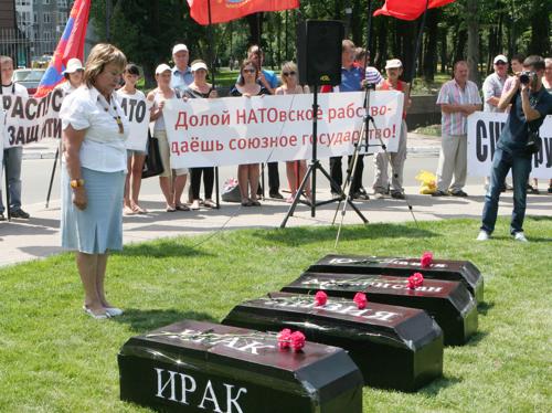 Акция началась с минуты молчания в память жертв агрессии. Наталия Витренко возложила цветы на гробы, выражая этим скорбь всего прогрессивного человечества о миллионах жертв в результате проводимой американцами политики мирового господства.