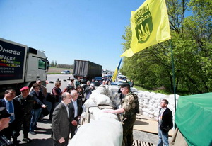 25 апреля 2014 г. самочинные киевские власти в рамках т.н. "второго этапа антитеррористической операции" на Юго-Востоке заблокировали все въезды в Славянск силами новосозданной Национальной гвардии: как заявил ее командующий Степан Полторак, "Чтобы не дать террористам возможности получить подкрепление, руководством государства было принято решение полностью заблокировать город Славянск".