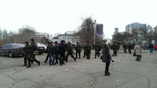 Кроме того, в начале Институтской улицы стоит около 10 бойцов АТО. Они сообщили, что будут помогать охранять правопорядок во время сегодняшних мероприятий.